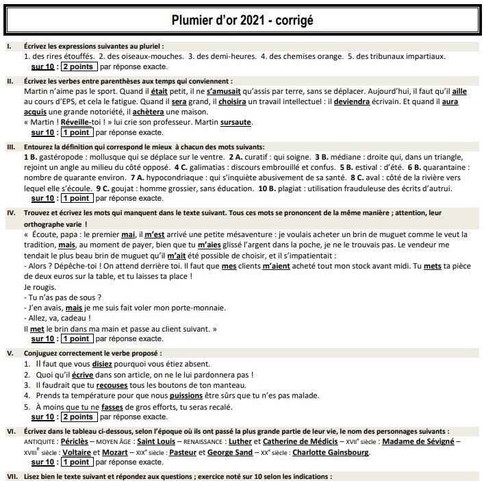 Corrigé du Plumier d'or 2021