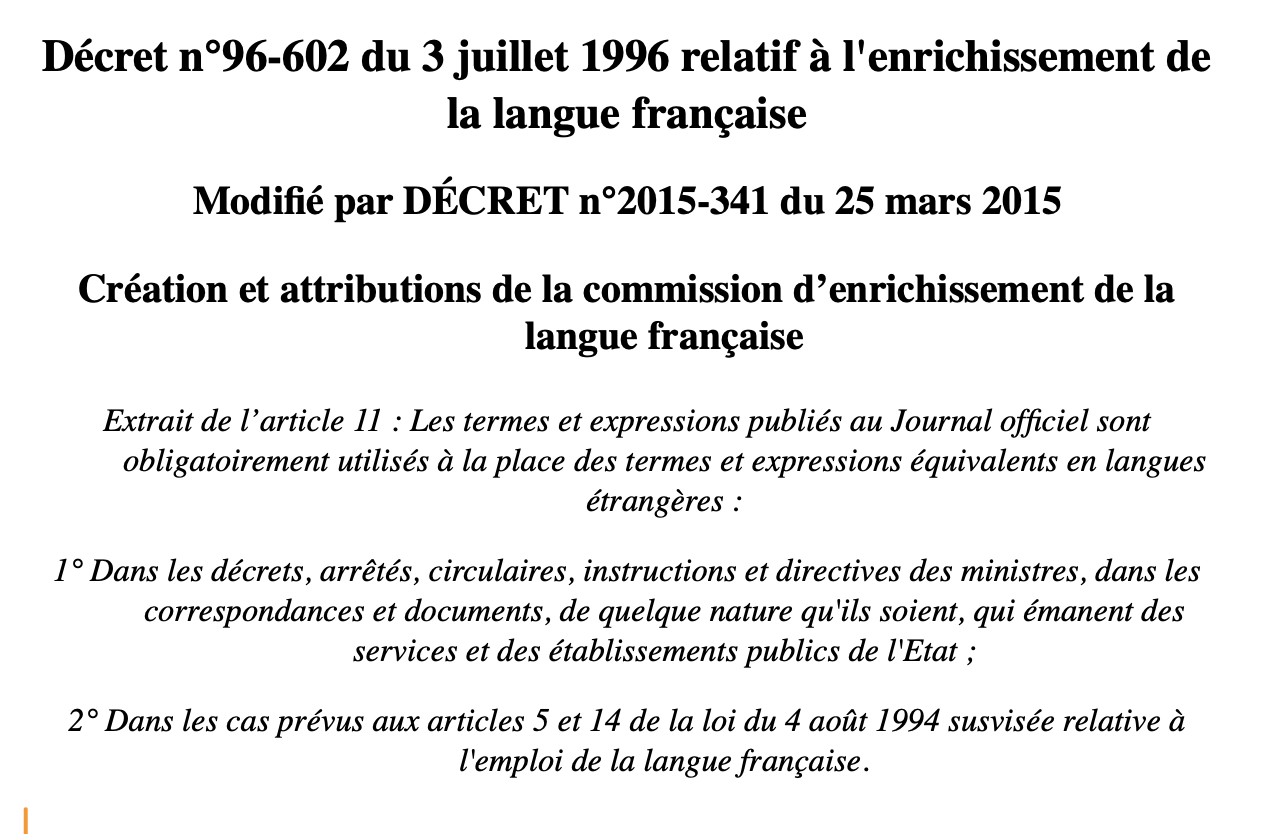 Extrait de l'article 11 : Les termes et expressions publiés au Journal officiel sont obligatoirement utilisés à la place des termes et expressions équivalents en langues etrangères :